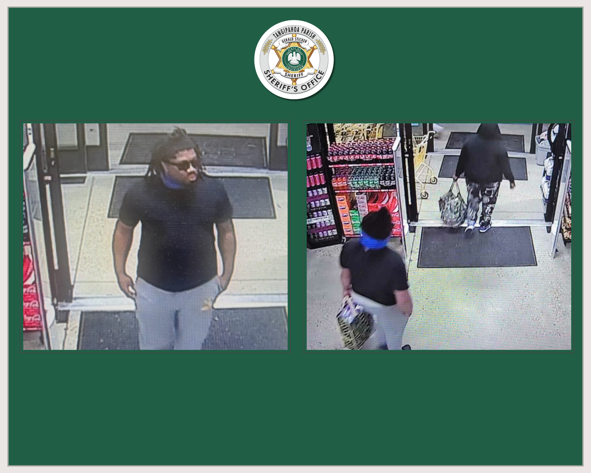 Sheriff Gerald Sticker encourages anyone with information about who these suspects are or their whereabouts, to contact Det. Earl McFarland at 985-514-8181or 985-351-8942.