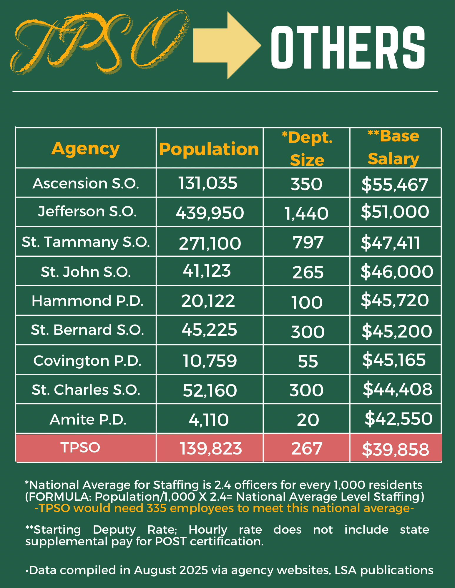 - Why are we including all parish residents in the population count? As the primary law enforcement agency for the entire parish, the full population IS our responsibility as Louisiana law considers our jurisdiction the entire parish-- unincorporated AND incorporated areas. The TPSO's statistics for "Assist Other Agency" (AOA) calls support that we do frequently serve within the parish's municipalities which means our manpower is stretched across all 823 square miles and for all 139,000+ of its residents. Some examples-- From July 1, 2024 through June 30, 2025, there were 428 AOA calls with Hammond Police. That's more than one call a day where TPSO and HPD work together on a call. In Independence, that number is just under 600. In Roseland, it's 321 and in the Villages of Tickfaw and Tangipahoa, the number is between 250-275 each. In Kentwood, it's around 100.